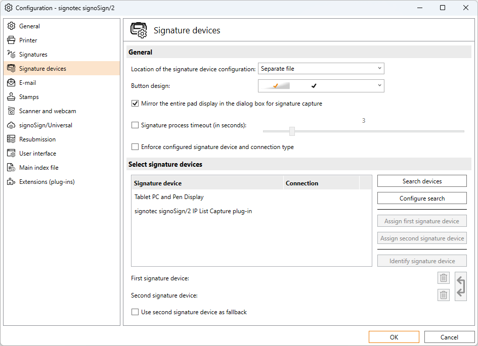 Perform a search via Search devices. If necessary, adjust the filter settings for connection type or operating mode beforehand via Configure search so that the signature pad can be found. Then select the desired signature pad and assign it using Assign first signature device. The assigned signature pad will then be displayed in the lower section and will be used for the electronic signature as long as it is configured there.
